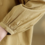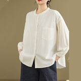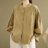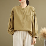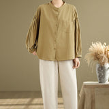 Buddha Stones Commute Plain Half Buttons Accordion Pleats Design Women's Cotton Linen Shirt